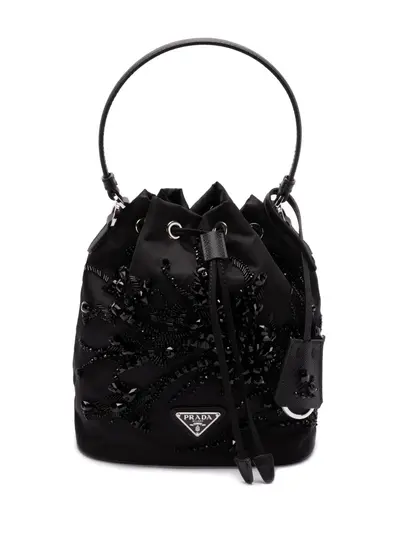 black recycled polyamide enamel triangle logo elasticated drawstring waistband single top handle adjustable detachable shoulder strap bead embellishment main compartment
