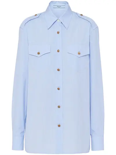 light blue cotton Prince of Wales check print embossed gold-tone buttons classic collar front button placket epaulettes long sleeves buttoned cuffs two chest flap pockets straight hem