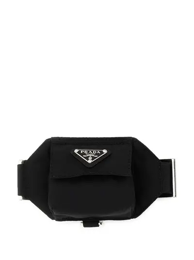 black canvas foldover top adjustable waist strap enamel triangle logo ring hardware detailing main compartment This piece comes complete with a protective dust bag.