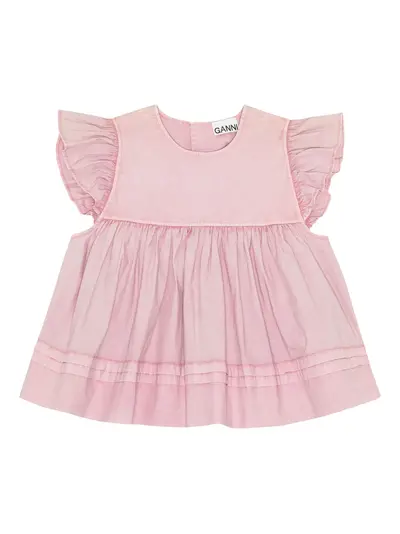 blush pink rear button fastening crew neck short sleeves ruffled detailing