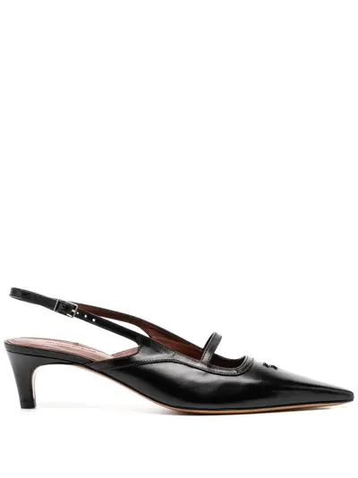 black leather pointed toe slingback strap signature fox motif silver-tone hardware branded leather insole mid heel slip-on style leather sole