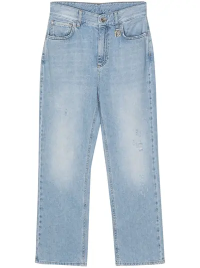 blue cotton denim mid-wash distressed effect ripped detailing gold-tone logo plaque contrast stitching belt loops classic five pockets cropped leg concealed fly and button fastening