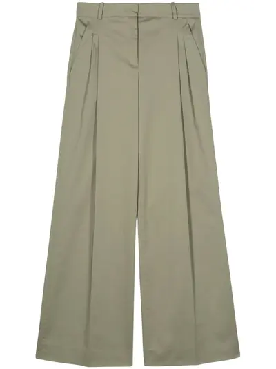 olive green stretch-cotton poplin texture belt loops pleat detailing two side slash pockets pressed crease two rear jetted pockets internal logo tag wide leg concealed front button, hook and zip fastening