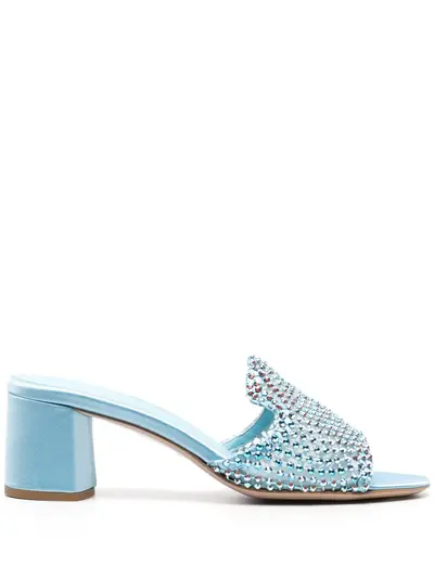sky blue satin finish mesh detailing crystal embellishment slip-on style branded leather insole round open toe leather outsole mid block heel