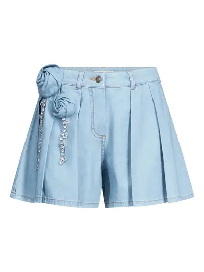 light blue front button fastening belt loops crystal embellishment floral appliqué