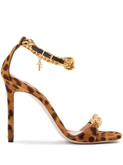 animalier brown calf hair all-over leopard print chain-link detailing logo charm gold-tone hardware square open toe single toe strap buckle-fastening ankle strap 105mm stiletto heel branded leather insole leather outsole