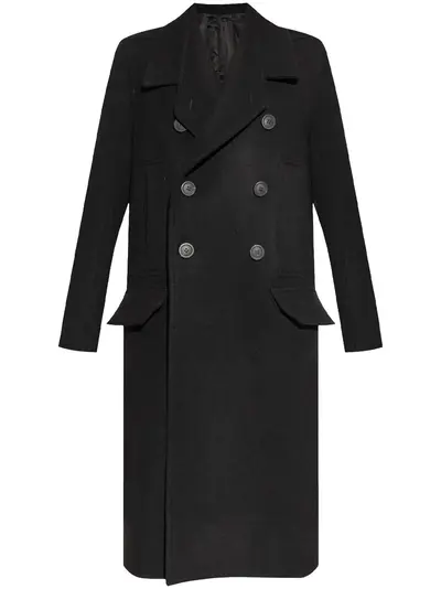 black wool long sleeves double-breasted button fastening internal pocket front flap pockets two side welt pockets wide lapel mid-length