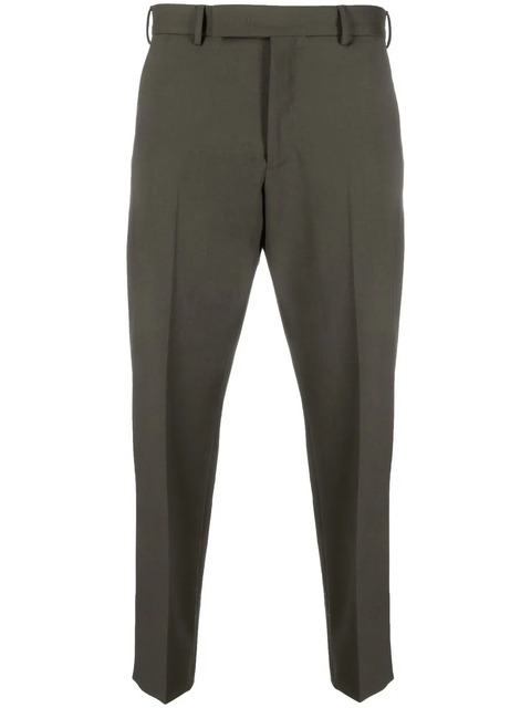 khaki virgin wool blend concealed front fastening belt loops two diagonal pockets to the sides two rear welt pockets cropped leg