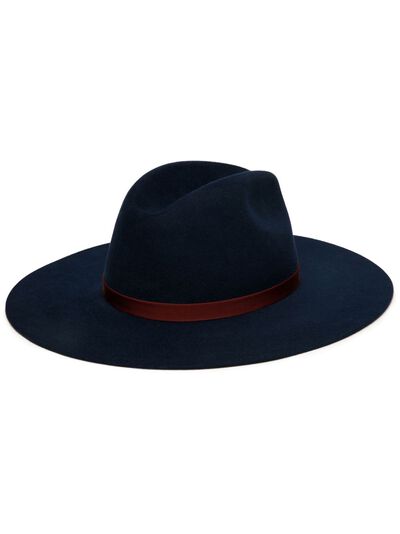 navy blue/bordeaux red wool felted finish embroidered logo ribbon detail at the crown concave crown curved wide brim
