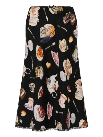 black dessert illustration print mid length elasticated waistband