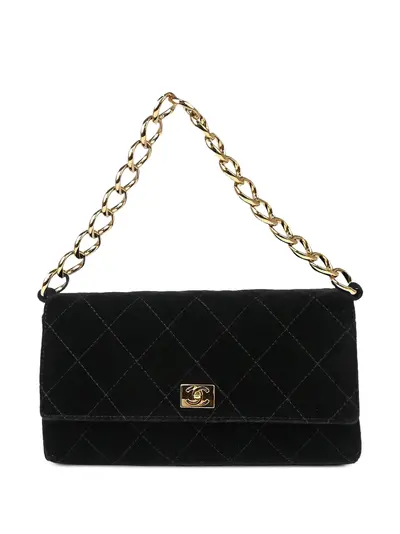 circa 2002 black velvet quilted finish signature interlocking CC turn-lock fastening chain-link shoulder strap main compartment internal slip pocket internal logo stamp slip pocket to the rear gold-tone hardware Serial Number:7616021 Condition: GOOD. This previously owned and used item is in good condition with minimal signs of use. This may include fading of material or plating and scratches.