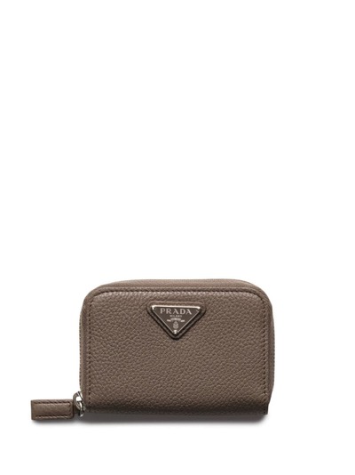 grey leather grained texture all-around zip fastening enamel triangle logo partitioned compartment