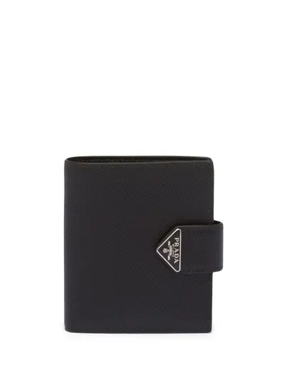 black leather Saffiano leather logo plaque foldover top with press-stud fastening internal card slots note compartment