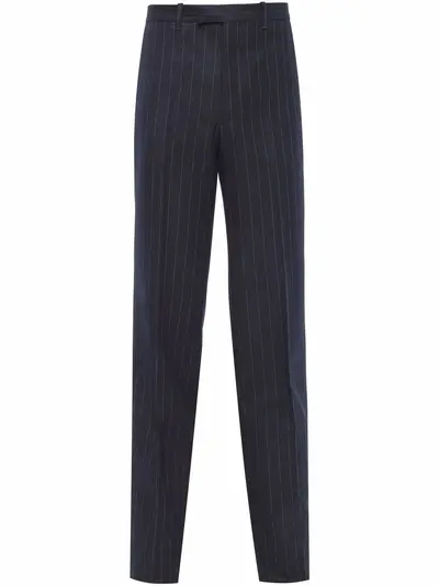 navy wool vertical stripe pattern belt loops concealed front fastening two side inset pockets two rear welt pockets straight leg