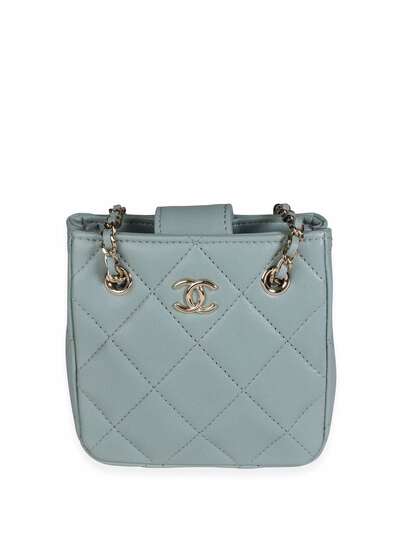 teal blue lambskin diamond quilting signature interlocking CC logo leather and chain-link shoulder strap internal logo patch striped lining gold-tone hardware