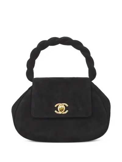 circa 1997 black suede single twisted top handle foldover top signature interlocking CC turn-lock fastening main compartment internal zip-fastening pocket gold-tone hardware Serial Number: 4759435 This item comes with an original Chanel authenticity card. Condition: GOOD. This previously owned and used item is in good condition with minimal signs of use. This may include fading of material or plating and scratches.
