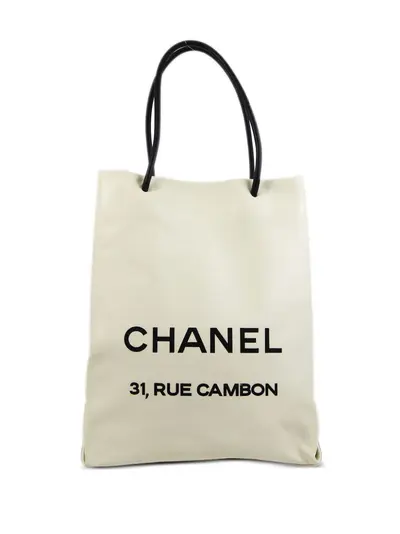 circa 2008 light beige calf leather signature Rue Cambon address print logo print to the front two rolled top handles open top main compartment internal zip-fastening pocket contrast lining silver-tone hardware Serial Number: 12779088 Condition: GOOD. This previously owned and used item is in good condition with minimal signs of use. This may include fading of material or plating and scratches.