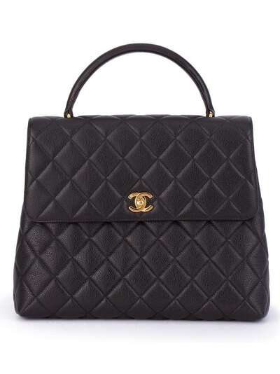 Black calf leather quilted tote from Chanel Pre-Owned featuring a trapeze body, a gold-tone logo plaque, a back slip pocket, a flat top handle, foldover top with twist-lock closure, an internal zipped pocket and an internal slip pocket. Please note that pre-owned items are not new and therefore might have minor imperfections. Please note that this item comes with a Chanel certificate of authenticity.