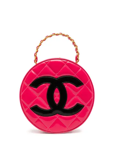 circa 1995 fuchsia pink patent leather diamond quilting signature interlocking CC logo two-way zip fastening leather and chain-link top handle internal patch pocket internal logo stamp full lining gold-tone hardware circular body Serial Number: 3348720 This item comes with an original Chanel authenticity card. This piece comes complete with a protective dust bag. Your purchase will arrive to you in its original packaging. Condition: GOOD. This previously owned and used item is in good condition with minimal signs of use. This may include fading of material or plating and scratches.