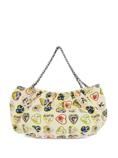 circa 2006 ecru/multicolour canvas heart print signature Mademoiselle profile motif signature camellia print signature interlocking CC logo two leather and chain-link shoulder straps magnetic fastening main compartment internal logo patch logo-jacquard lining silver-tone hardware Serial Number: 10648164 This item comes with an original authenticity seal. This item comes with an original Chanel authenticity card. Condition: EXCELLENT. This previously owned item is in near-perfect condition with no signs of damage or use.