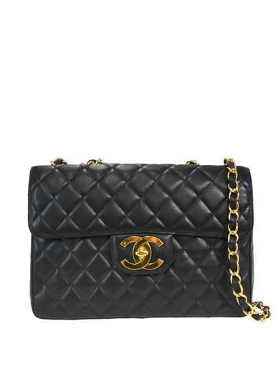 circa 1995 black caviar leather diamond quilting leather and chain-link shoulder strap front flap closure signature interlocking CC turn-lock fastening main compartment internal slip pocket internal zip-fastening pocket internal logo stamp contrast lining rear patch pocket gold-tone hardware Serial Number: 3708902 This item comes with an original authenticity seal. Condition: GOOD. This previously owned and used item is in good condition with minimal signs of use. This may include fading of material or plating and scratches.