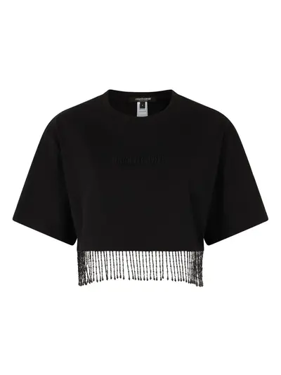 black round neckline short sleeves beaded fringe detailing cropped silhouette tonal logo lettering relaxed fit straight hem