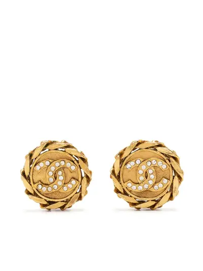 circa 1998 gold plated signature interlocking CC logo rhinestone embellishment chain-link trim clip-on design These earrings come as a pair. Condition: GOOD. This previously owned and used item is in good condition with minimal signs of use. This may include fading of material or plating and scratches.