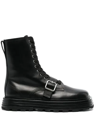 black calf leather panelled design silver-tone hardware square toe front lace-up fastening buckle-strap fastening ankle-length pull-tab at the heel chunky rubber sole