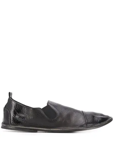 Black leather Strasacco slip-on loafers from Marsèll featuring cracked effect leather, a round toe, elasticated side panels, a pull tab at the rear and a flat leather sole.
