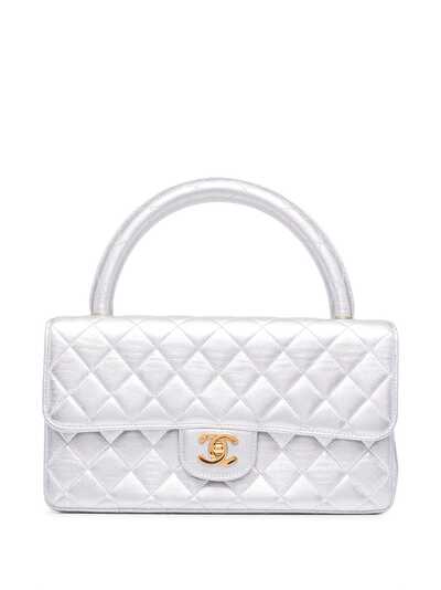 circa 1992 silver-tone lambskin diamond quilting signature interlocking CC turn-lock fastening signature stitched interlocking CC logo foldover top single rounded top handle rear patch pocket internal zip pocket internal patch pocket internal logo stamp leather lining gold-tone hardware rectangle body Serial Number: 2967939 Condition: GOOD. This previously owned and used item is in good condition with minimal signs of use. This may include fading of material or plating and scratches.