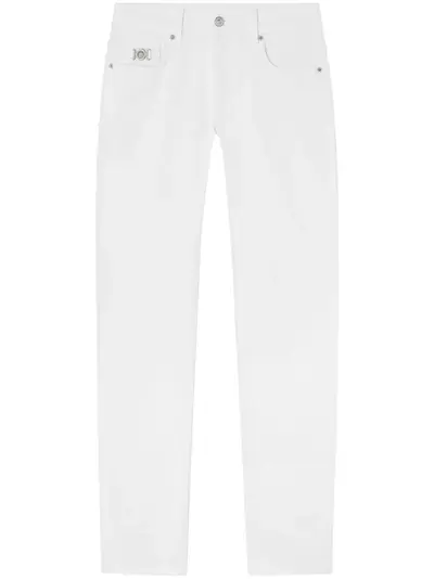 optical white stretch-cotton straight leg Medusa Head motif leather tag mid-rise belt loops button fly fastening classic five pockets ankle-length