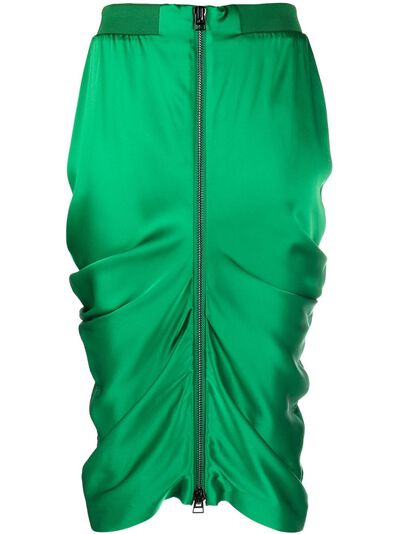 jade green silk satin draped detailing high waist front zip fastening pencil silhouette asymmetric hem mid-length