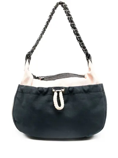 navy blue/pink/black cotton/leather two leather and chain-link shoulder straps top zip fastening drawstring fastening main compartment internal zip-fastening pocket internal logo patch signature interlocking CC logo silver-tone hardware Serial Number: 9842914
