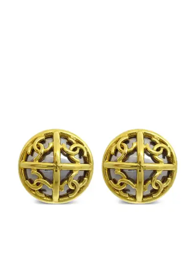 circa 1993 gold plated polished finish signature interlocking CC logo faux-pearl embellishment cut-out detailing clip-on design circular body These earrings come as a pair. Condition: GOOD. This previously owned and used item is in good condition with minimal signs of use. This may include fading of material or plating and scratches.
