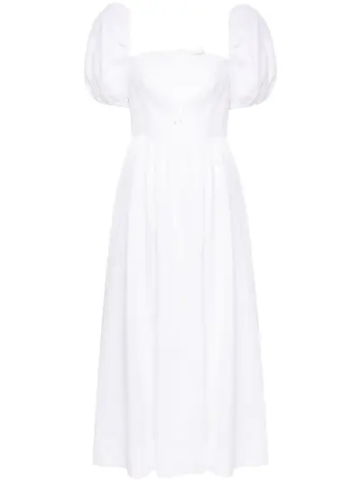 white linen/flax lace trim bow detailing smocked panel square neck short puff sleeves A-line skirt straight hem organic-cotton lining mid-length