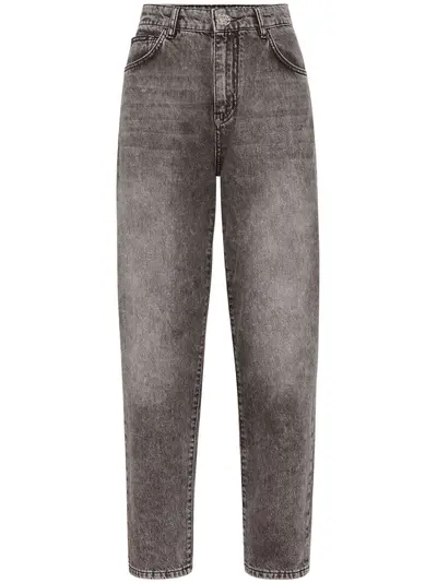 dark grey cotton stonewashed whiskering effect appliqué logo mini logo tag belt loops concealed fly and button fastening high-waisted tapered leg cropped classic five pockets