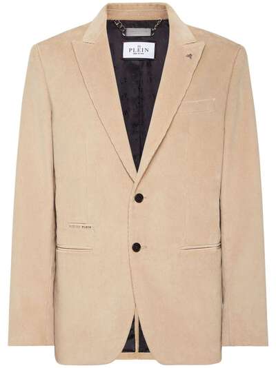 beige cotton blend velvet front button fastening peak lapels brooch detail long sleeves jetted chest pocket logo-embossed buttons appliqué logo two front welt pockets central rear vent full lining straight hem