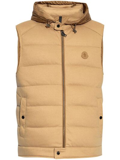 beige feather down two-way zip fastening drawstring hood sleeveless appliqué logo two side welt pockets straight hem