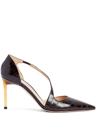 coffee brown calf leather embossed crocodile effect elasticated strap 85mm stiletto heel pointed toe branded leather insole leather sole