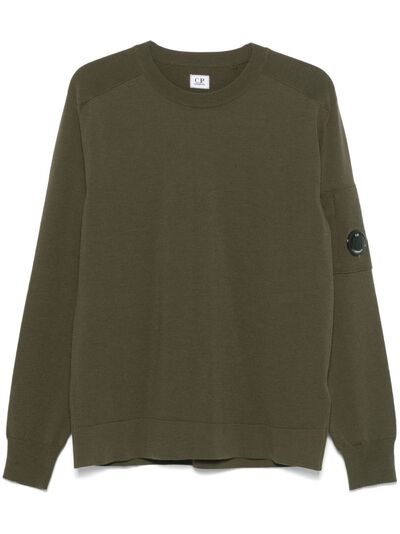 olive green virgin wool blend knitted construction crew neck long sleeves sleeve zip pocket signature Lens detail ribbed cuffs and hem C.P. Company suggests removing any detachable accessories before washing.