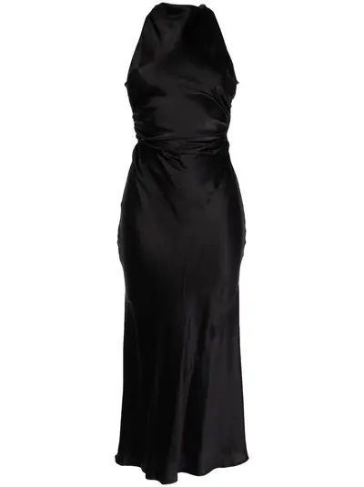 black silk sleeveless draped detailing open back rear criss-cross straps mid-length