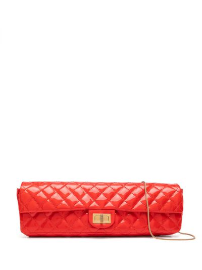 circa 2008 bright red leather interlock weave sliding chain-link shoulder strap main compartment internal slip pocket internal patch pocket Condition: GOOD. This previously owned and used item is in good condition with minimal signs of use. This may include fading of material or plating and scratches.