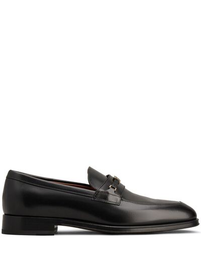 black leather brushed effect slip-on style logo plaque chain-link detailing moc stitching apron toe branded insole contrast lining leather sole