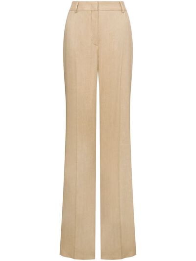 beige linen blend tailored cut concealed front fastening high-waisted belt loops two side inset pockets flared