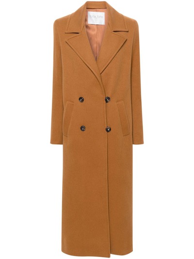 brown virgin wool wide notch lapels double-breasted button fastening long sleeves buttoned cuffs two side slit pockets rear slit straight hem calf-length