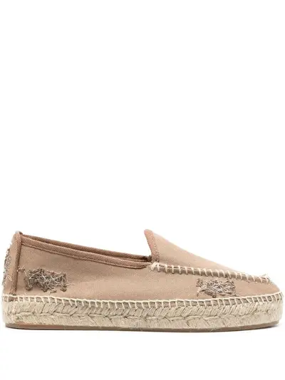 beige cotton embroidered design decorative stitching almond toe flat rubber sole jute sole