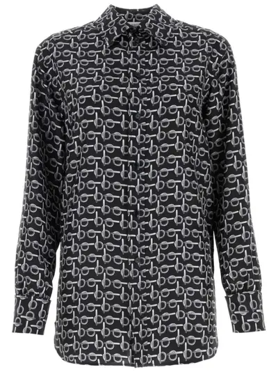 black/silver-tone silk all-over graphic print classic collar concealed front fastening mother-of-pearl buttons long sleeves straight hem