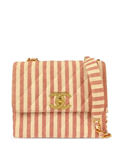 circa 1995 red/white canvas vertical stripe pattern front flap closure signature interlocking CC turn-lock fastening fabric and chain-link shoulder strap main compartment full lining gold-tone hardware Serial Number: 3235319 Condition: GOOD. This previously owned and used item is in good condition with minimal signs of use. This may include fading of material or plating and scratches.