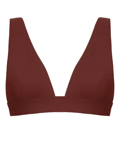 chocolate brown clasp fastening triangle cup wide shoulder straps Be mindful to try on swimwear over your own garments.