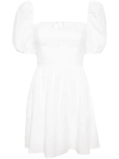 white linen concealed rear zip fastening short puff sleeves square neck lace trim bow detailing smocked panel flared skirt organic-cotton lining